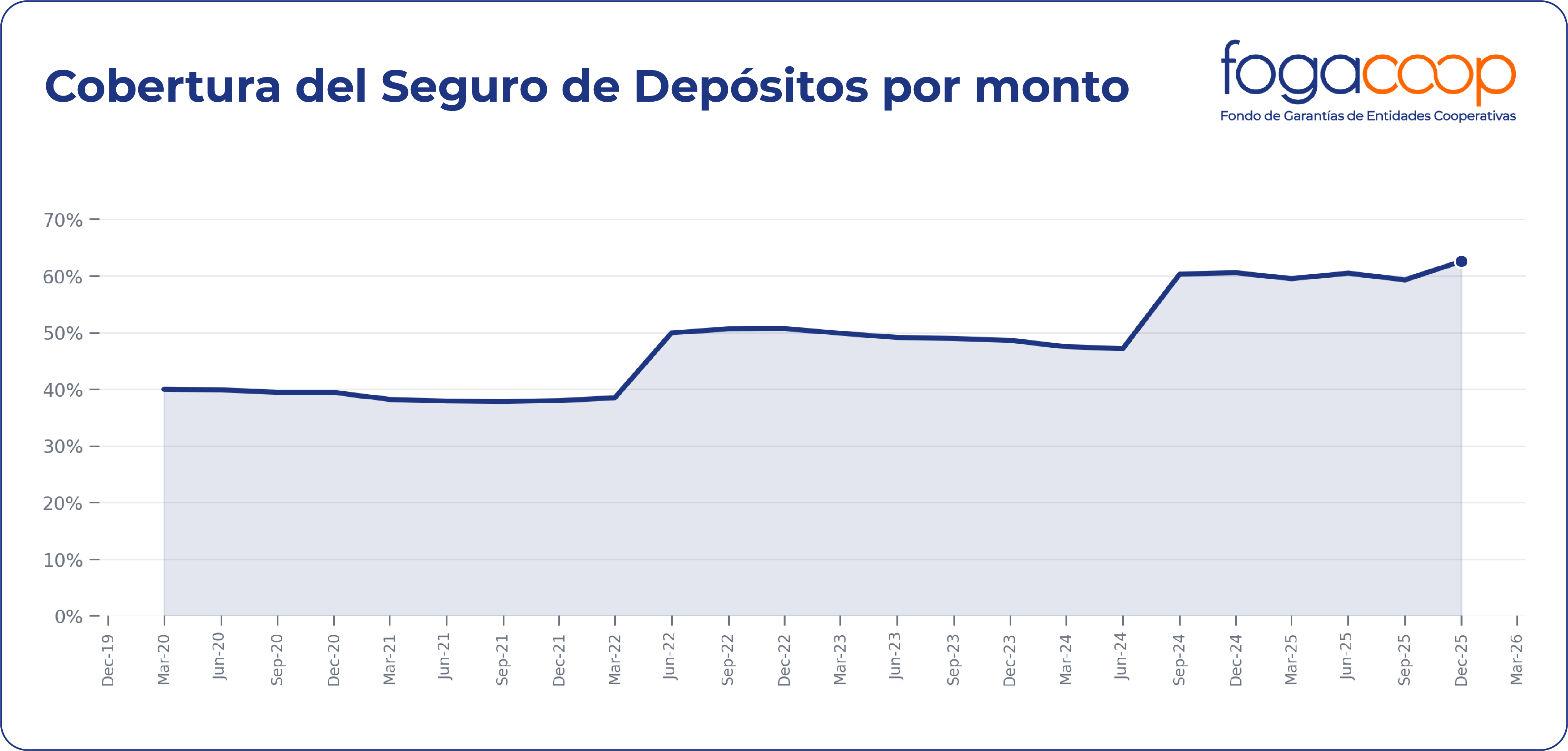 El indicador mide la participación del Seguro de Depósitos entre el total de los depósitos de las cooperativas inscritas. Formula: Depósitos asegurados / Total depósitos = $11.32 billones/ $18.09 billones